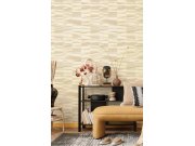 Luxusní metalická vliesová tapeta s plastickým béžovým geometrickým vzorem na podkladě imitující štukovou omítku. Foto interiéru je pouze ilustrační - odlišné barvy.