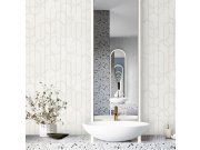 Luxusní vliesová tapeta s vinylovým povrchem, efektní geometrický retro vzor v odstínech bílé, šedé a stříbrné. Foto interiéru je pouze ilustrační - odlišné barvy.