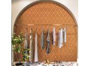 Hnědo-béžový vyšívaný vzor ve stylu Art Deco na vliesové tapetě s oranžovým podkladem.