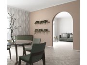 Šedo-hnědá vliesová tapeta s vinylovým povrchem, efektní geometrický vzor se stříbrnými odlesky, nádech starorůžové, textilní struktura.