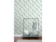 Geometrická vliesová tapeta na zeď, trojúhelníky v odstínech zelené a bílé.