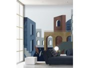 Grafická vliesová tapeta na zeď, odstíny hnědo-červené, modré, okrové, zelené a šedo-béžové, architektonický design. z 5 dílů 0,53 x 280cm. Tapeta má navazující vzor, pokud potřebujete pokrýt širší stěnu, stačí přikoupit další kus (sadu 5 pruhů). Jednotli
