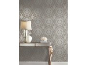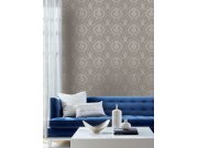 Hnědá předklížená tapeta na zeď, stříbrný jemně plastický ornamentální zámecký vzor.
