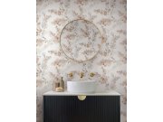 Bílá vliesová tapeta na zeď, květiny v odstínech hnědé, béžové a zelené.