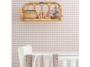 Hladká vliesová tapeta na zeď, károvaný vzor v odstínech bílé a starorůžové. Bílé čtverce cca 2,8 x 2,8 cm.