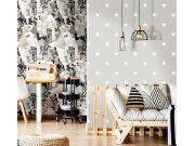 Kolážová vliesová tapeta nejen pro teenagery, v odstínech bílé, hnědé, béžové, černé a stříbrné.