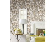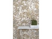 Krémová vliesová tapeta na zeď, rostliny a listy v odstínech hnědé, šedé a béžové, zlaté obrysy.