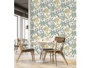 Krémová vliesová tapeta s listy v odstínech šedé a krémové, látková textura. Foto interiéru je pouze ilustrační - odlišné barvy.