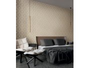 Krémová vliesová tapeta evokující látkovou texturu, zlatý plastický elegantní vzorek připomínající větvičky.