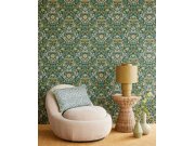 Ornamentální květinová tapeta na tmavě zeleném podkladu s přírodními motivy.