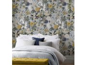Netradiční květinová vliesová tapeta na zeď, efekt tkaniny. Hot House Floral představuje moderní pojetí květinového trendu. Vytvořeno ve dvou nádherných barevných kombinacích, půlnoční a Sunshine s nádechem šafránu a fialové smíchanými s chladnou šedou a