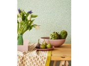 Vliesová tapeta na zeď - něžný květinový vzor dodá interiéru jemnost. Světle zelený podklad s fialovými kvítky.