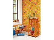 Pestrý květinový vzor na žluto-oranžové vliesové tapetě.