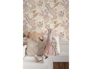 Květinová tapeta v jemných pastelových odstínech na krémovém podkladu.