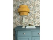 Temně modrá vliesová tapeta se secesním květinovým vzorem v odstínech zelené, hnědé, béžové a starorůžové.
