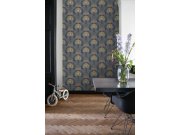 Temně modrá vliesová tapeta se secesním květinovým vzorem v odstínech zelené, hnědé, béžové a starorůžové.