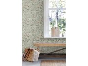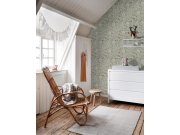 Zelená vliesová tapeta na zeď, motivy květin v odstínech zelené, růžové a okrové.