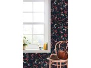 Temně modrá vliesová tapeta na zeď, motiv květin, listů, větviček a bažantů.