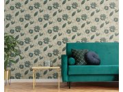 Vliesová, jemná přírodní/šedo-béžová tapeta s výraznými texturami. Květinový vzor, šedo-hnědé plastické obrysy se stříbrnými flitry, listy smaragdově zelené.