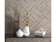 Luxusní vliesová tapeta s vinylovým povrchem, věrná imitace hrubší textilie s geometrickým vzorem, odstíny hnědo-béžové s jemným pololeskem. Foto interiéru je pouze ilustrační - odlišné barvy. Co vás zaujme: kvalita zpracování, vysoká odolnost. Design: lu