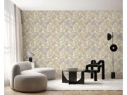 Luxusní vliesová tapeta s vinylovým povrchem, motivy listů v odstínech kovově lesklé béžové a hnědé na béžovém podkladu.