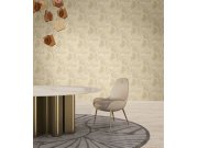 Luxusní vliesová tapeta s vinylovým povrchem s neobvyklým vzorem - plastické vlnky a lístky v béžovém odstínu se stříbrným a zlatým vzorem větviček s květinami a lístky.