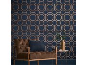 Luxusní vliesová tapeta s měděnými metalickými ornamenty na tmavě modrém podkladu.