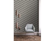 Design tropických listů, podklad netradiční jemně plastický geometrický vzor v odstínech pololesklé šedo-stříbrné. Snadno zkombinujete se souvisejícími vzory. Podklad vlies, povrch vinyl.
