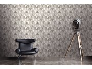 Luxusní vliesová tapeta s vinylovým povrchem, šedo-béžová, plastický hnědo-zlatý geometrický vzor.