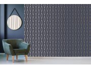 Vliesová tapeta s látkovou texturou. Metalický, částečně setřený, geometrický vzor na tmavě modrém podkladu.