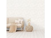 Krémová vliesová tapeta s vinylovým povrchem, jemná textura s perlovým leskem, netradiční vzor s hexagony. Foto interiéru je pouze ilustrační - odlišné barvy.