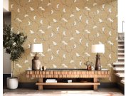 Luxusní hnědá vliesová tapeta s vinylovým povrchem, efekt jemné textilie s rozkvetlými větvičkami v odstínech hnědo-zlaté a bílé.