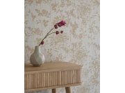 Béžová vliesová tapeta s vinylovým povrchem, hnědé pololesklé motivy květin, imitace hrubé rustikální textilie. Foto interiéru je pouze ilustrační - odlišné barvy.