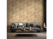 Luxusní vliesová tapeta s vinylovým povrchem; plastický, pololesklý, hnědo-béžový vzor s drobnými zlatými třpytkami.