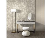 Luxusní metalická béžovo-stříbrná vliesová tapeta na zeď se vzorem větviček s listy. Foto interiéru je pouze ilustrační - odlišné barvy.