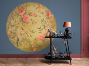 Vliesová, kruhová tapeta se stonky růží a ptáky v jemných pastelových odstínech.