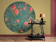 Vliesová, kruhová tapeta se stonky růží a ptáky v modrých odstínech.