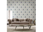 Luxusní metalická modro-stříbrná zámecká vliesová tapeta s ornamenty na geometrickém podkladu.