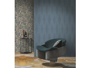 Luxusní jemně strukturovaná tapeta se zlato-béžovým zámeckým vzorem na modrém podkladu se zlatými třpytkami.