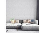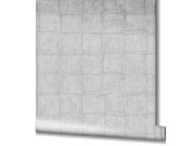 Šedo-stříbrná vliesová tapeta s vinylovým povrchem, plastické čtverce.