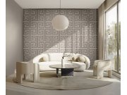 Luxusní vliesová tapeta s vinylovým povrchem, béžové geometrické vzory, látková textura, šedo-hnědý pololesk.
