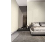 Luxusní šedo-bílá vliesová tapeta s vinylovým povrchem, plastický geometrický vzor s metalickým pololeskem. Foto interiéru je pouze ilustrační - odlišné barvy.