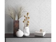 Luxusní šedo-bílá vliesová tapeta s vinylovým povrchem, plastický geometrický vzor s metalickým pololeskem. Foto interiéru je pouze ilustrační - odlišné barvy.