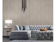 Vliesová tapeta s elegantním metalickým vzorem v béžové barvě na šedém podkladu v imitaci štuku. . Šíře role 1,06 m.