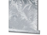 Pololesklá šedo-stříbrná jemně plastická vliesová tapeta s vinylovým povrchem, vzor palmových listů. Foto interiéru je pouze ilustrační.