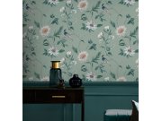 Luxusní vliesová tapeta s exotickými květinami v jemných šedých a zelenkavých barvách na světle zeleném podkladu.