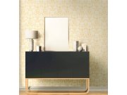 Vinylová, světle béžová tapeta zlatým ornamentálním vzorem. Jemný pololesk.