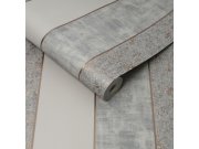 Vinylová tapeta. Střídání plastických, žíhaných a jednobarevných hladkých matných ploch a prolisů v odstínech šedé a růžového zlata.