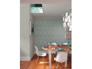 Vinylová tapeta. Jemně plastická textura v tónech zelené / tyrkysové a hnědo-béžové, design hrubší textilie.