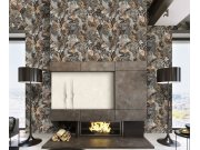 Černá vliesová tapeta s vinylovým povrchem, hnědé motivy květin, imitace hrubé rustikální textilie.